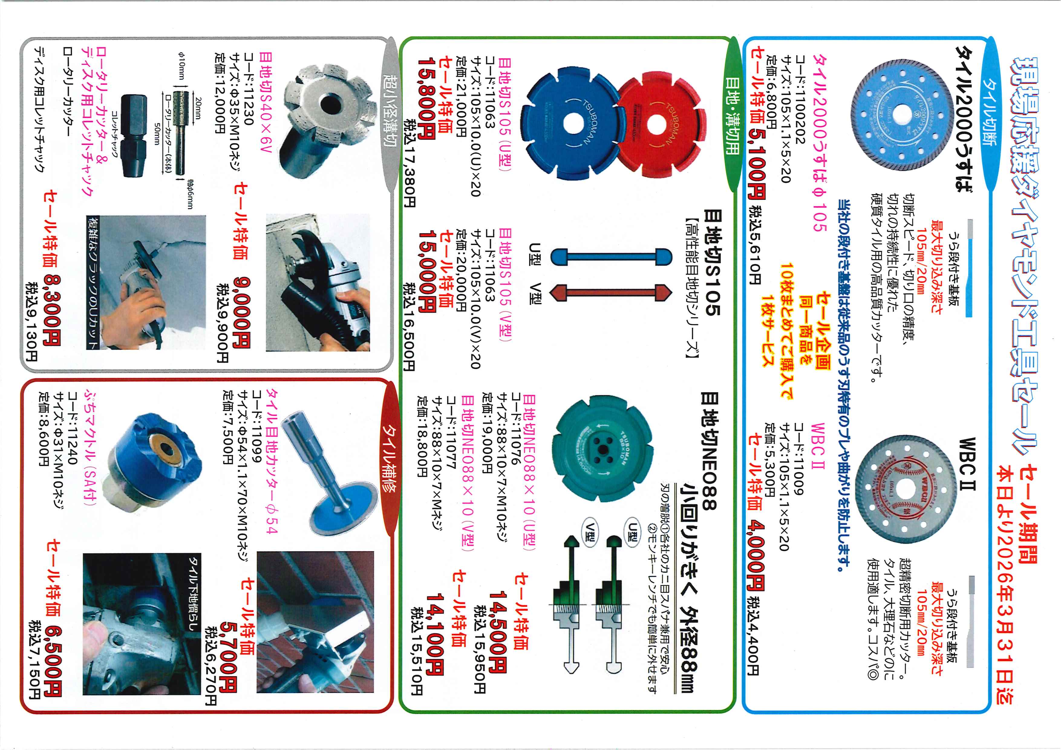 【セール】ツボ万 現場応援ダイヤモンド工具セール ニュース < 前のお知らせ 次のお知らせ > 日付 2026/01/21 内容 株式会社ツボ万様より現場応援ダイヤモンド工具セールのお知らせです。セール期間:2026年3月31日(火)までチラシに掲載されている商品がセール特価や10枚注文で1枚サービスなどお得なセールとなっております。掲載の画像以外にも対象商品がございますので、ぜひ添付のチラシを開いてみてください。製品の詳細や価格等につきましては、弊社営業までお問い合わせください。 添付ファイルダウンロード ファイルをダウンロード ツボ万 現場応援ダイヤモンド工具セール.pdf < 前のお知らせ 次のお知らせ >